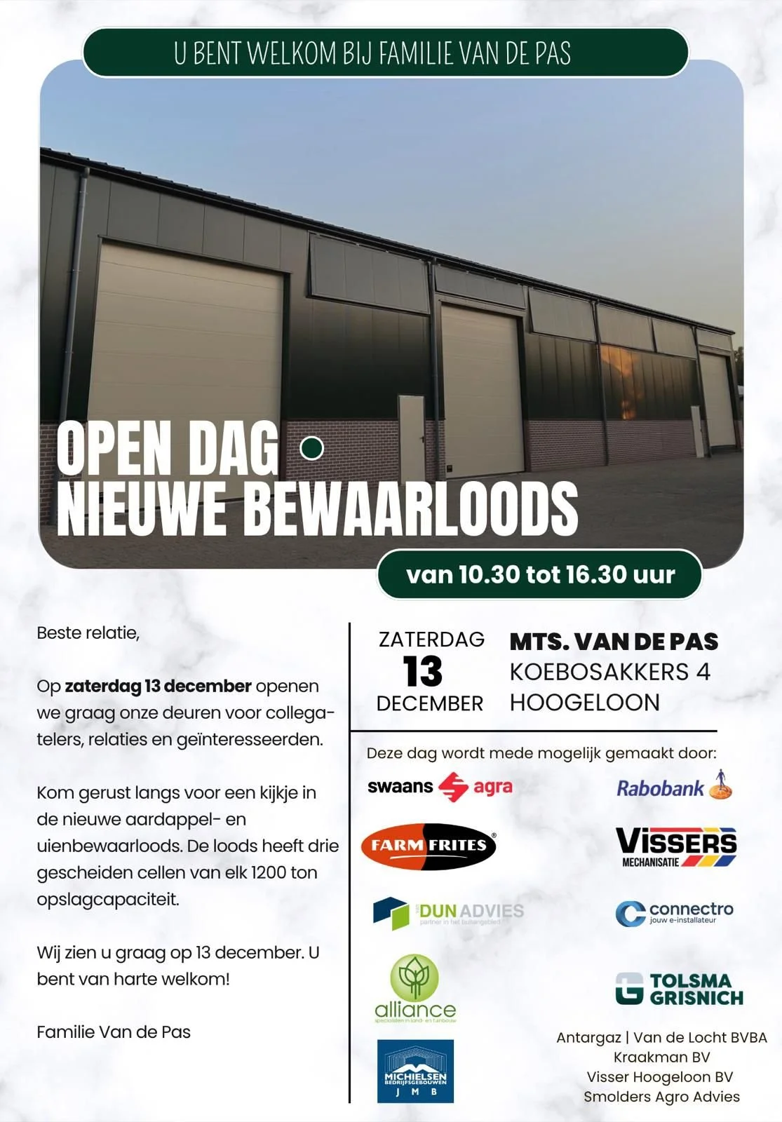 Van harte welkom op de open dag van de nieuwe bewaarloods van familie Van De Pas in NL-Hoogeloon